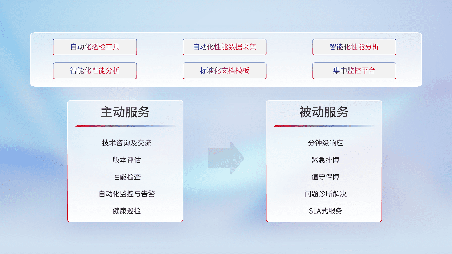 智能化工具和标准化文档,,,保障服务质量,,,提供主动服务(包含技术咨询、、、版本评估、、、性能检查、、、、自动化监控与告警、、、、健康巡检)和被动服务包含(分钟级响应、、、、紧急排障、、、、值守保障、、、问题诊断解决、、、、SLA服务)。。。