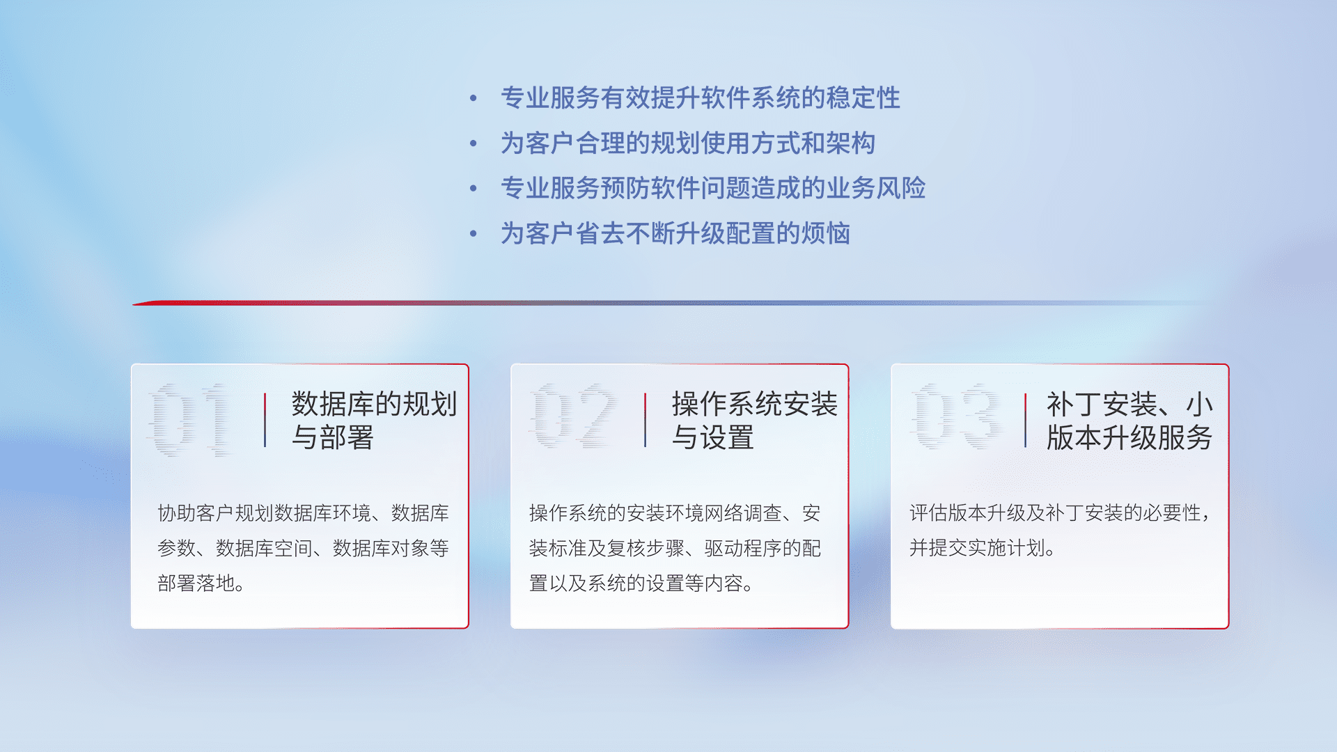 为客户提供软件规模升级、、、、快速部署、、、、按需配置的专业服务,,,从数据库的规划与部署到操作系统的安装与设置,,再到补丁安装和小版本升级提供支持。。。。