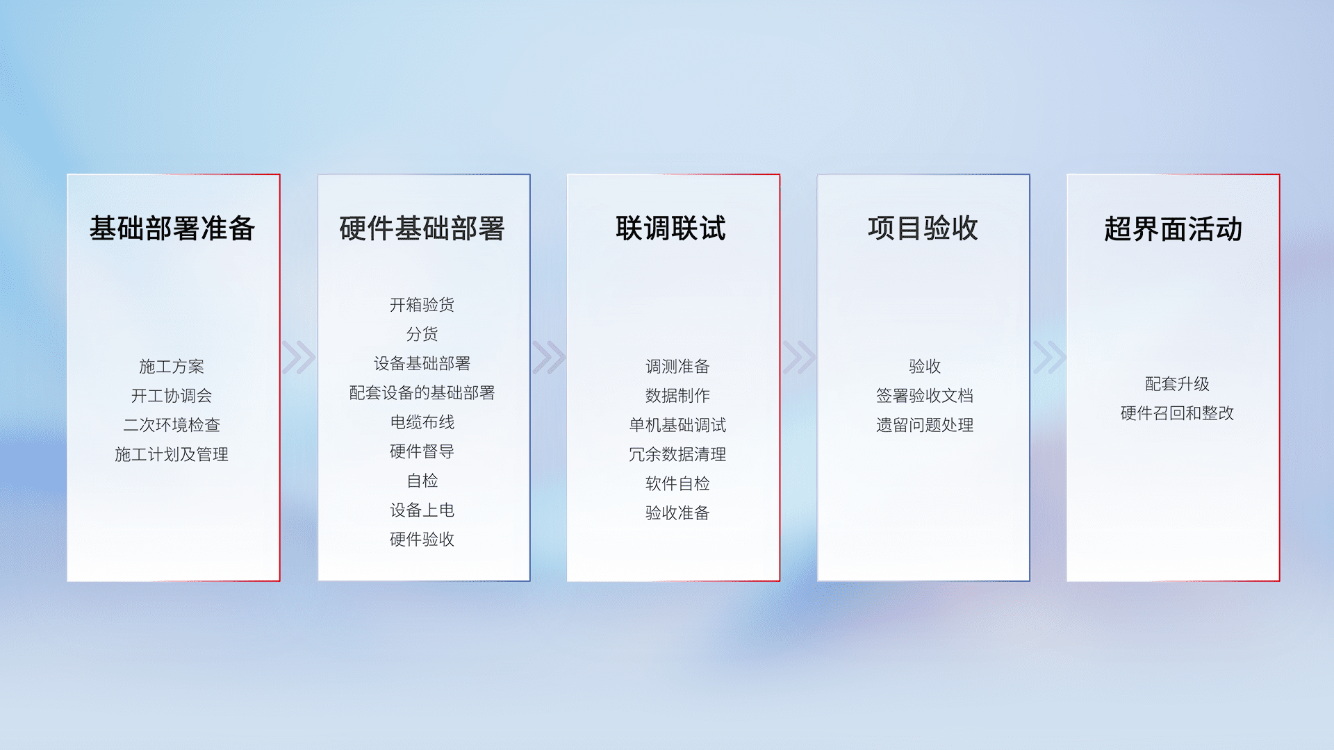 从基础部署准备、、硬件基础部署、、、、联调联试、、项目验收、、越界面活动的全过程可追溯,,,保证施工质量和进度。。。。